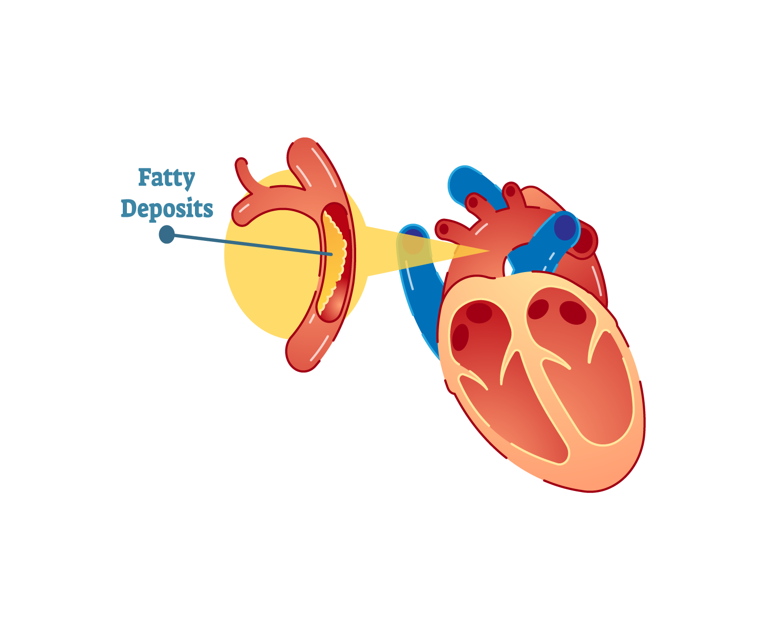 If blood flow is completely cut off—usually by a blood clot forming on top of a narrowed artery—a heart attack (myocardial infarction) occurs, damaging the heart muscle. Common causes of obstruction include: